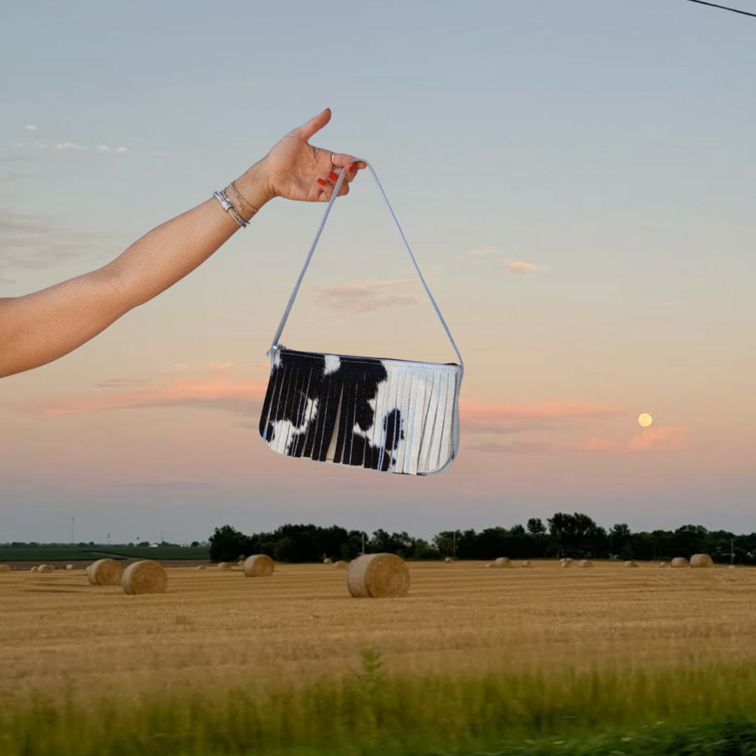A fresh take on our signature Fringe Shoulder Bag—now reimagined in true cowhide. Each bag blends artisan craftsmanship with natural textures, creating a one-of-a-kind piece that feels both rugged and refined. The signature fringe detailing adds movement and edge, while the cowhide brings unique markings and character that make every bag truly yours. These fringe hide bags come with a hide interior pocket and have a magnetic closure.