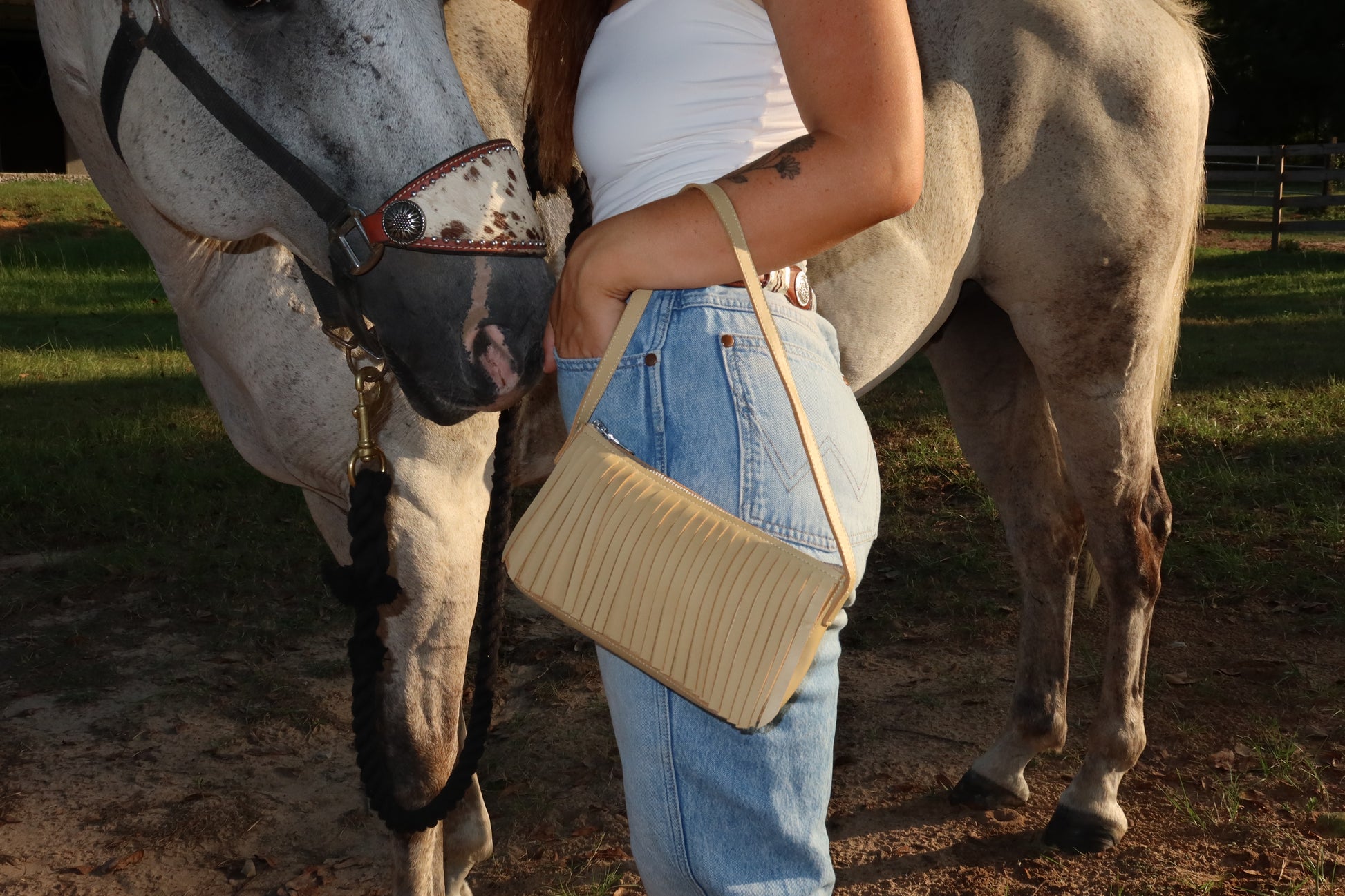 This shoulder bag is perfect to fit all your dinner accessories with fringe on the exterior and an interior pocket. All bags will have an interior pocket. Perfect for Fall!