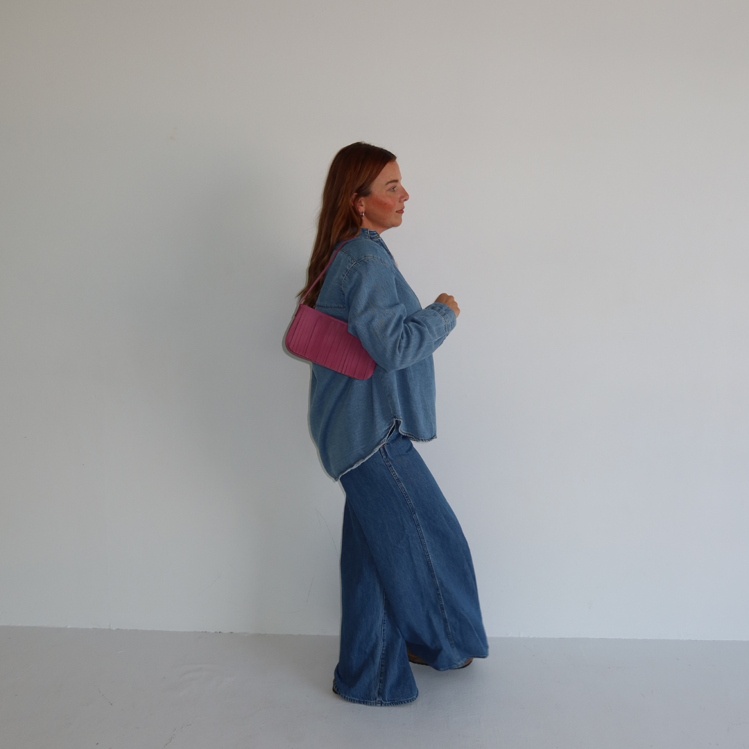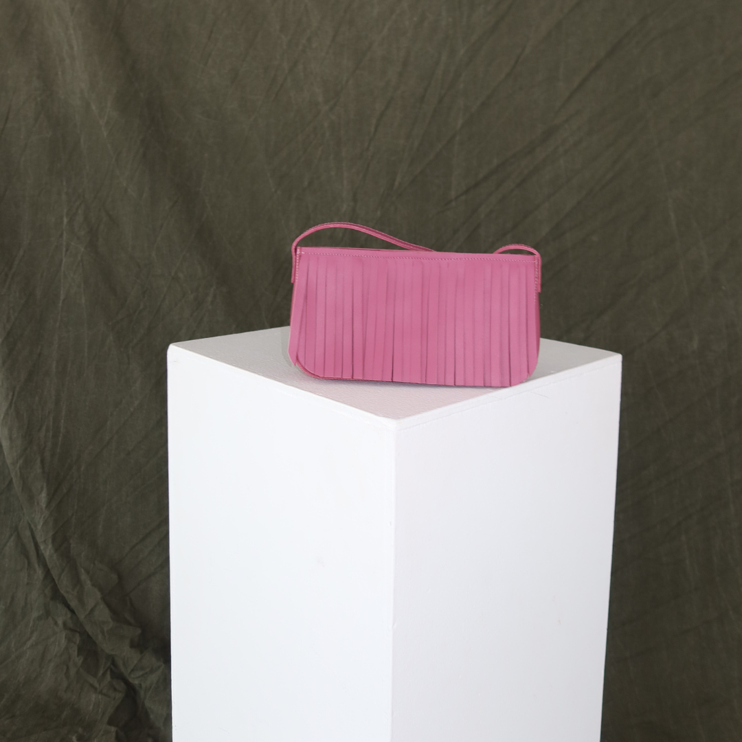 This shoulder bag is perfect to fit all your dinner accessories with fringe on the exterior and an interior pocket. All bags will have an interior pocket. Perfect for Fall!